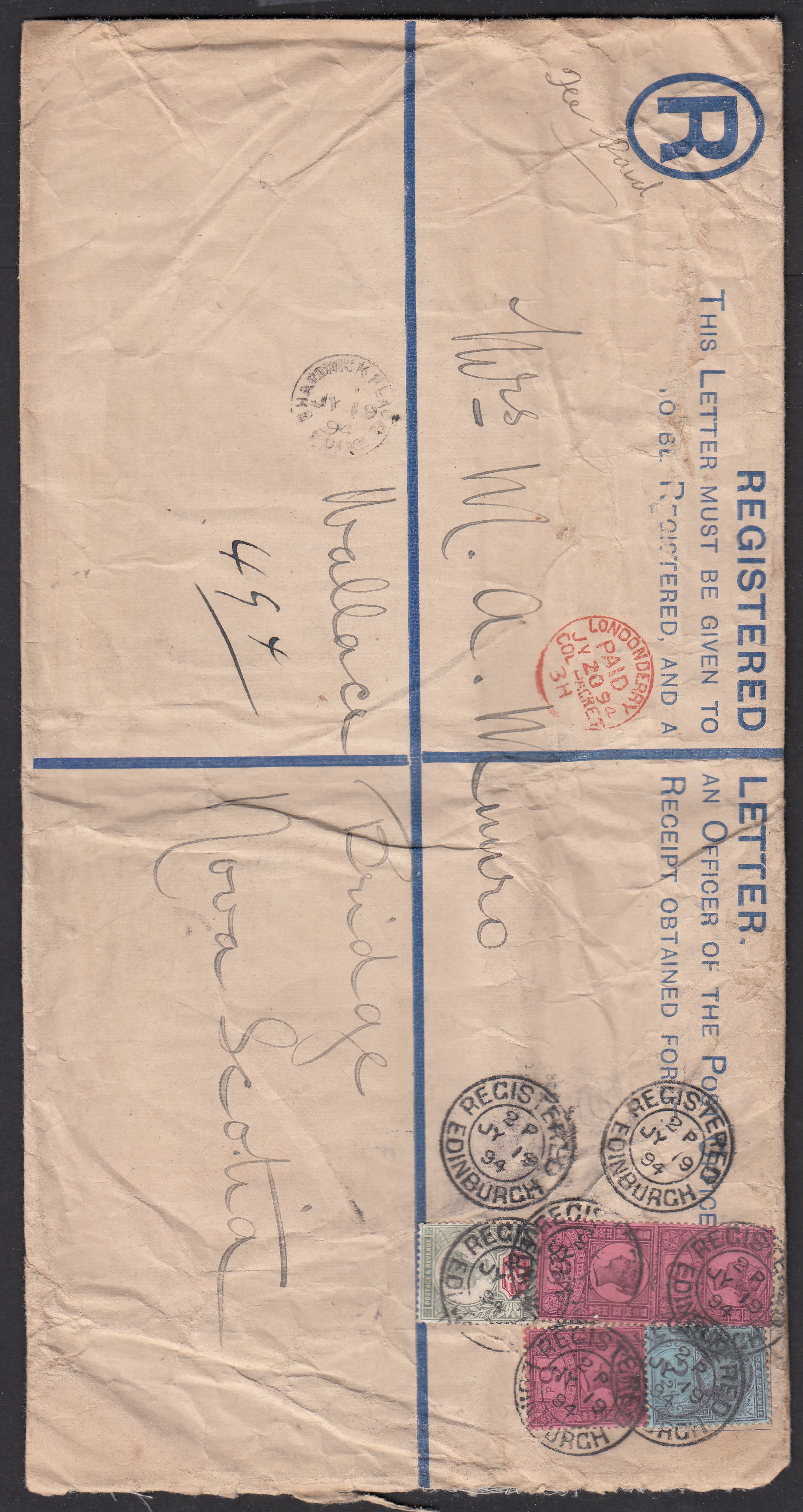 Lot# 38: QUESNEL BC A large cut down envelope. Registered . cds ties 1 cent and 10 cent Edwards dated 1908 paying the triple registered rate. Scarce usage. Est $40........Image